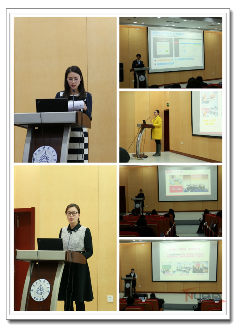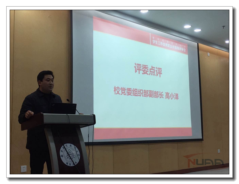 ![]() 辅导员们立足学院特色、结合自身工作所长、工作特点带来了一场精彩纷呈的汇报,不仅较为全面的展示了辅导员的工作能力水平,更处处流露出辅导员与对学生的关爱与真情,对这份职业的信仰与坚守。答辩会最后,校党委组织部副部长高小泽进行了点评,他表示辅导员每项工作成绩的背后都聚凝着心血,在付出的同时,辅导员能看到学生成长是幸福,辅导员能锻炼自身成长是幸运的,这成就了我校能战斗、能吃苦、能创造、有高度的辅导员工作队伍。他希望辅导员坚持身份自信,做到引领而不是迎合学生、牵引需求而不是需求牵引,做草根文化的甄别者,融会贯通抓工作。 ![]() 为了更加全面、准确评价辅导员的工作业绩,进一步加强我校辅导员日常工作的目标导向性,提升辅导员对整体工作的谋划力、控制力,建立导向鲜明的工作目标机制,2016年,初学工部、研工部面向全体辅导员公布了《南京航空航天大学辅导员工作规范》,进一步明确辅导员日常工作目标任务,并规定了辅导员年终考核、推优的各项指标。自学校人事处下发考核通知后,学工部、研工部、校团委制定出考核方案,经过程评价、学院推优、年级工作组推优、研工部推优、团委推优,最终推选出了16名本科生辅导员、5名研究生辅导员和4名学院团委书记参加今天的答辩会。