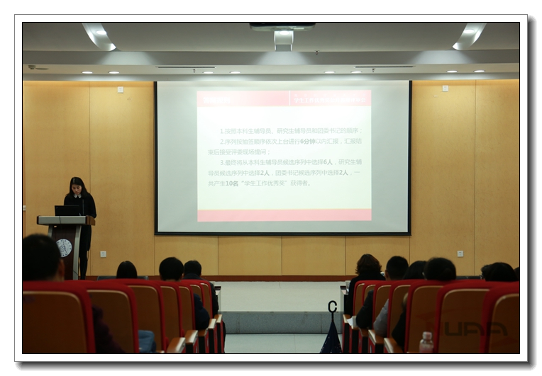 1月6日上午,我校2016年学生工作优秀奖公开答辩会在将军路校区图书馆报告厅举行。校党委组织部、宣传部、人事处、教务处、马克思主义学院、学生处、研工部、校团委等部门和学院领导担任了评委,各学院党委副书记、学生代表参与投票,全体专兼职辅导员参加评审会。