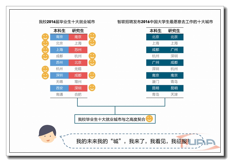 在区域和城市选择上,就业总人数的三分之一、超过2000人在江苏工作,其中,95%的毕业生集中在苏南和苏中地区。近年来,南航毕业生就业城市的前十位相对比较稳定,主要是南京、苏州等长三角地区城市,北京、上海、深圳、南京、杭州等政治经济中心城市,以及沈阳、成都等国防科技工业单位聚集城市,与《智联招聘2016中国年度最佳雇主总报告》发布的“大学生最愿意去工作的前十大城市”高度契合。