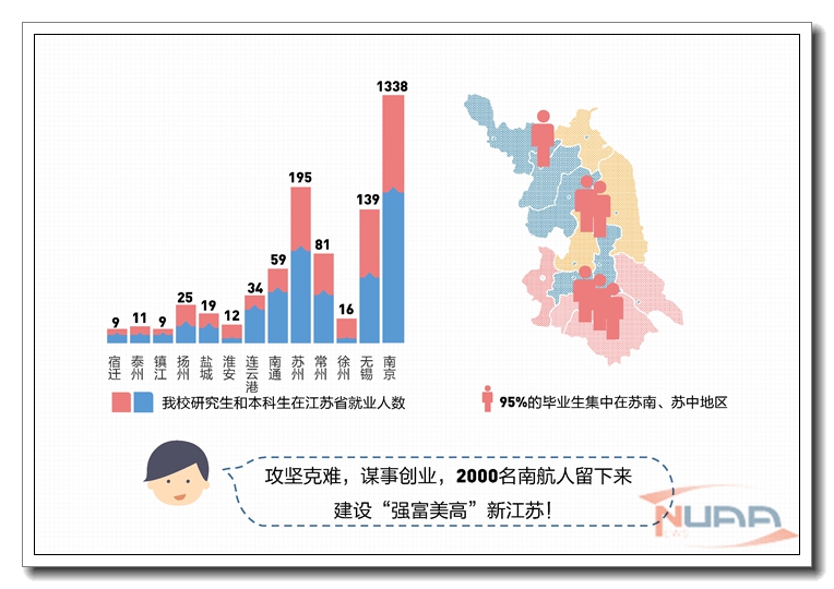2016年,该校进一步巩固了“一体两翼”为主体就业市场,一体两翼具体指,立足江苏,面向全国,以国防科技工业为主体,以民航、世界五百强企业为两翼。2016届毕业生中,共有1382人在国防科技工业相关行业,1298人在世界500强公司,798人在民航业,占据总就业人数的一半以上。 毕业生聚集大城市 用人单位满意度高