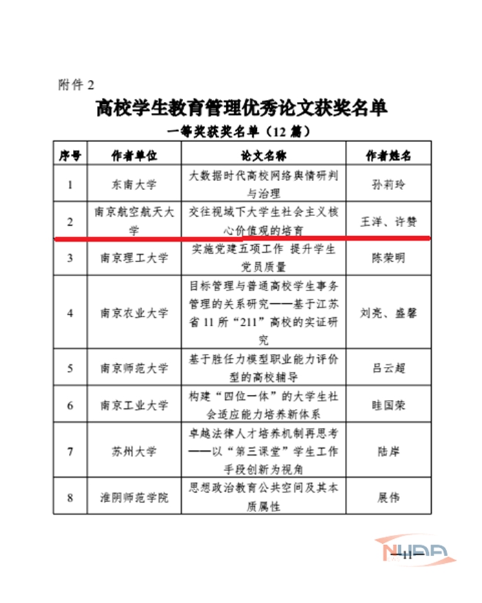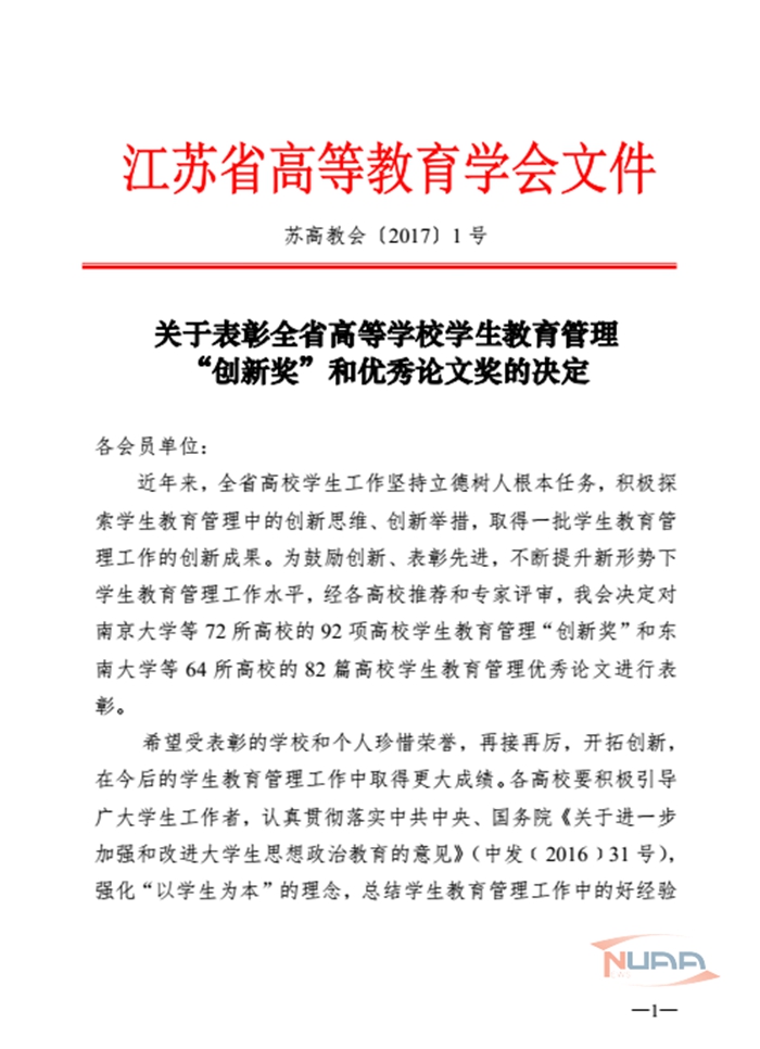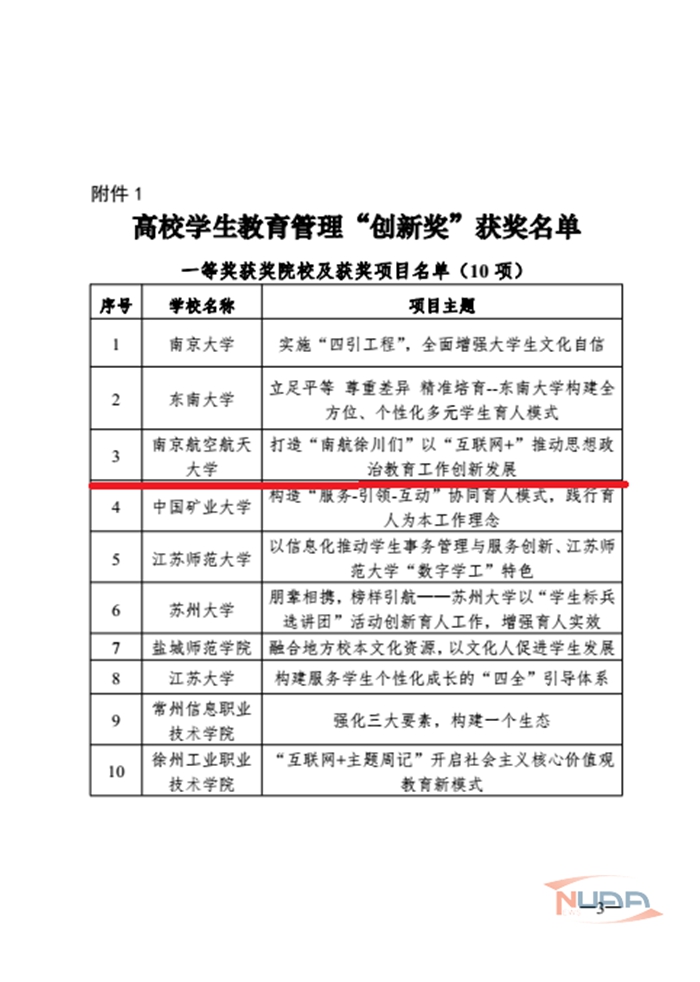 日前,江苏省教育厅发文表彰了近三年全省高校学生教育管理工作创新成果。由我校申报的《打造“南航徐川们”,以“互联网+”推动思想政治教育工作创新发展》项目荣获学生教育管理“创新奖”一等奖。这是我校继2013年以来连续第二次荣获该奖项一等奖。此外,由机电学院党委副书记许赞、辅导员王洋撰写的论文《交往视域下大学生社会主义核心价值观的培育》荣获学生教育管理优秀论文一等奖。