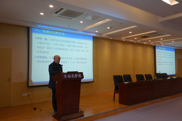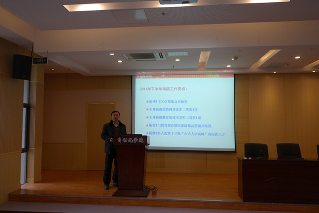 接着,院长姜斌代表学院做工作报告,报告从党建、教学、科研、师资、学科建设、人才培养、学生工作和工会工作等八个方面全面对学院2016年下半年的进行全面总结,对2017年的工作进行全面部署。2016年下半年,学院多方面取得了新的突破和发展,突出亮点有新增1个工信部重点实验室,主持获批国防科技进步二等奖1项、教育部技术发明二等奖1项,新增1门教育部首批国家级精品资源共享课,新增6名入选第十三批“六大人才高峰”高层次人才等。姜院长要求全体教师在2017年要以“十三五”规划和“双一流”建设为契机,乘势而上,科学发展,全面推进学院各项工作再上新台阶,为创建研究型学院而努力!