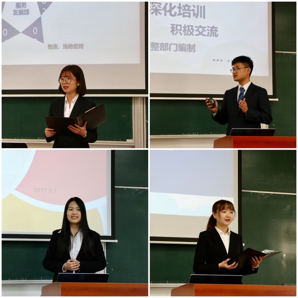 接着,科协主席周立华则是用一个“赢”字贯穿了整个分享,强调了“赢在起点、赢在过程、赢在过程”;团委副书记钱晓霞进行了“在忙碌中学会思考、乐于收获”的主题分享,结合自己工作的心路历程对自己和大家提出了更高的要求和期待;学生会副主席徐杭赟在“做好、学好、玩好”的主题中为大家讲述如何自我管理与正确规划;民航联盟主席于金锦与大家分享如何做到“热情与责任心并重”,从“凝聚性、服务性、多元性、创新性”四个方面展示了一个学生组织的发展理念;最后,学生会主席史静远在“感悟、交流、前行”的主题中带领大家寻找曾经的初心,希望七院学生组织在新的学期一如既往的优秀和强大。