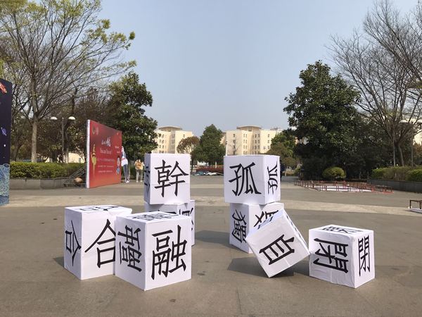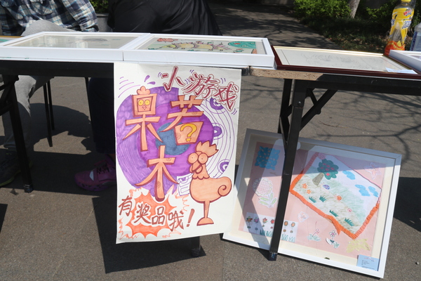 上午路人较少,摊位上只卖出去几个收纳袋,直到有一位同学向志愿者们详细了解了义卖活动以及自闭症儿童在中国的一些现状,买走了第一幅画作,志愿者们才感受到了莫大的支持和信心。12点铃声响起,为了吸引下课的同学们,志愿者们进行了当下火爆的假人挑战活动,摊位上驻足围观的同学也越来越多。