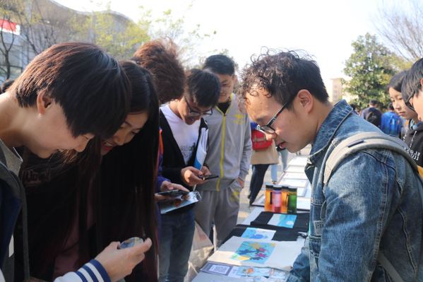此外,印有孩子们所绘图案的钥匙扣、水杯、笔记本、零钱袋等周边产品,对自闭症日的介绍展板,以及志愿者们对特殊教育学校志愿活动的介绍展板也引得不少同学们驻足。