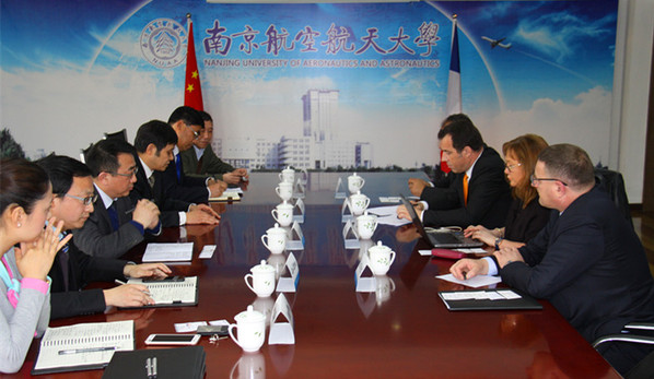 2017年4月7日上午,法国国立高等工程技术学院(简称ENSAM)校长罗兰·尚巴内教授一行4人访问南京航空航天大学。校长聂宏教授、副校长宋迎东教授接见了尚巴内校长一行,双方就进一步加强合作进行了会谈,共同签署了南京航空航天大学—法国国立高等工程技术学院国际合作框架协议,在人才交流、学生交换、实验室共建等方面寻求更多合作。在框架协议的基础上,双方还签署了工程/硕士专业双学位项目合作协议书,每年选拔优秀学生共享两校教育资源,完成学业后可获得双学位证书。