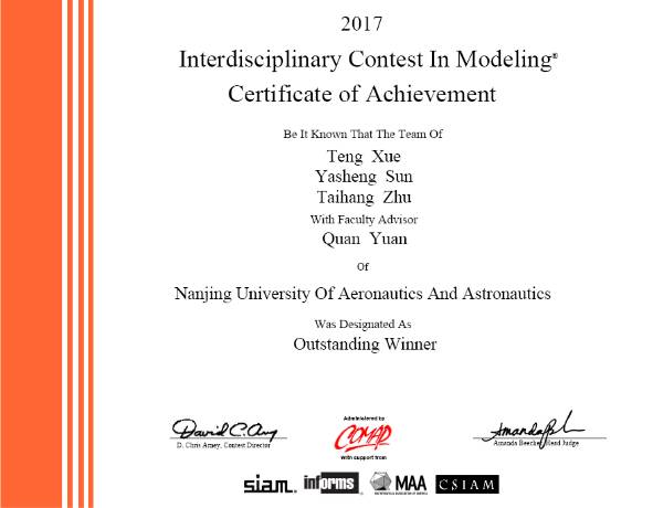 在本次比赛中,我校薛腾、朱太行、孙亚圣等三名同学的团队最终荣获特等奖。比赛期间,同学们齐心协力,镇定自若,逻辑严谨,并提前8小时提交了论文,最终摘下特等奖的桂冠,这是我校在该赛事上的历史性突破。