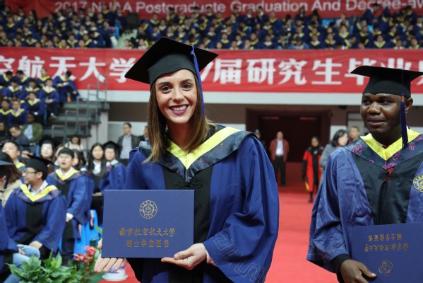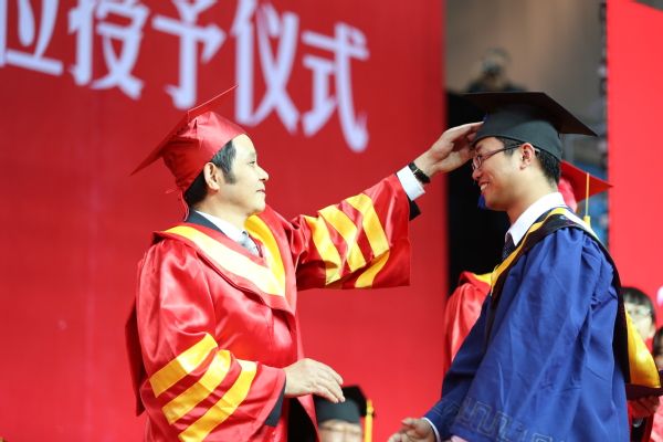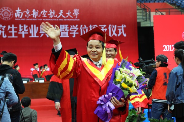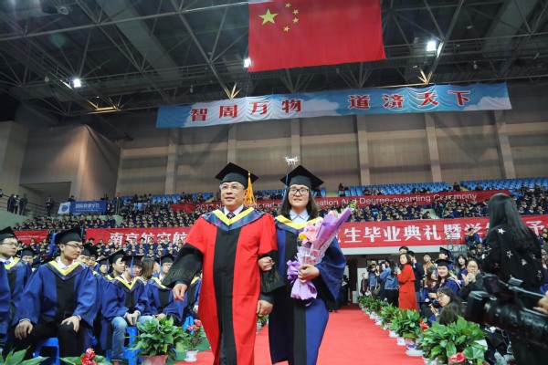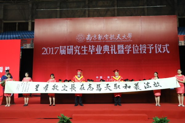 典礼中首次增加了师生走红毯环节。共22名来自各学院的毕业之星手挽导师走过红毯,由党委书记郑永安颁证、校长聂宏拨流苏。他们中既有研究生创新实践大赛大奖获得者、国家奖学金获得者、留学研究生达人,也有校首部原创话剧导演、校园年度人物这样的校园明星。22位毕业之星在全场师生的见证下,手挽辛勤指导自己的导师走过红毯,在主席台前向导师献上鲜花并深鞠一躬,表达着对授业恩师最真挚的谢意;导师为学生正衣冠,表达着对毕业学子最殷切的关爱。和学生黄帅一起走红毯的导师徐惊雷教授在回忆学生的一点一滴进步时,一度激动得哽咽:“很感动!带学生就跟带孩子一样,学生的优秀实际上是老师的荣幸,毕业的学生以后很多都是我们的同行,在振兴国家航空航天的事业上,我们都是同志,他们以后的路、舞台会比我们更长、更宽广!”