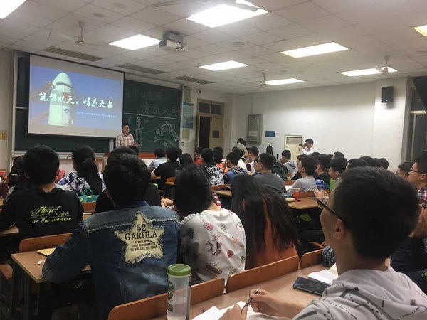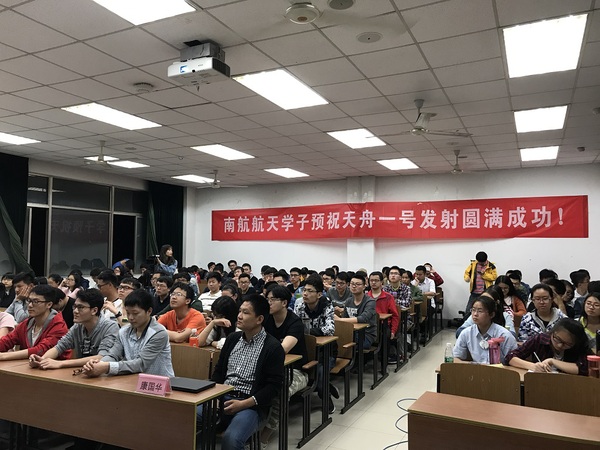 2017年4月20日,时值中国航天日临近,中国首艘货运飞船“天舟一号”发射之际,航天学院组织各年级航天学子分别在两校区观看直播,微小卫星中心主任康国华教授和航天控制系闻新教授现场介绍,与大家共同见证这一历史性的时刻。