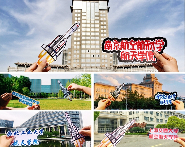 “我们是中国航天事业坚定的后备力量!我们为中国航天献上未来航天人的祝福!”4月24日,我校航天学子联合北航、西工大、浙大、交大等九所设置航天院系的高校,共同推送纪念“航天日”微信。文中介绍了学校及航天院系概况,还配发特制的“航天照”——各个学校用统一的手绘小火箭和院校标志建筑物的合照,献礼第二个航天日。