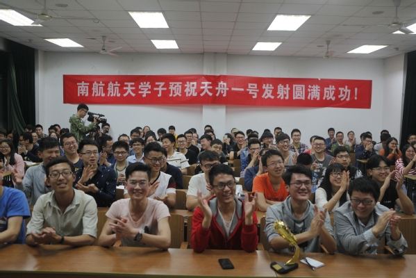 4月20日晚,中国首艘货运飞船天舟一号成功发射,南航学生在两校区观看了此次“天舟一号”发射直播,共同见证这位太空“快递小哥”上天,活动现场分别邀请了我校闻新教授和康国华教授进行讲解。当晚,江苏电视台公共新闻频道、城市频道、江苏新闻广播对将军路校区活动现场进行了同步直播。