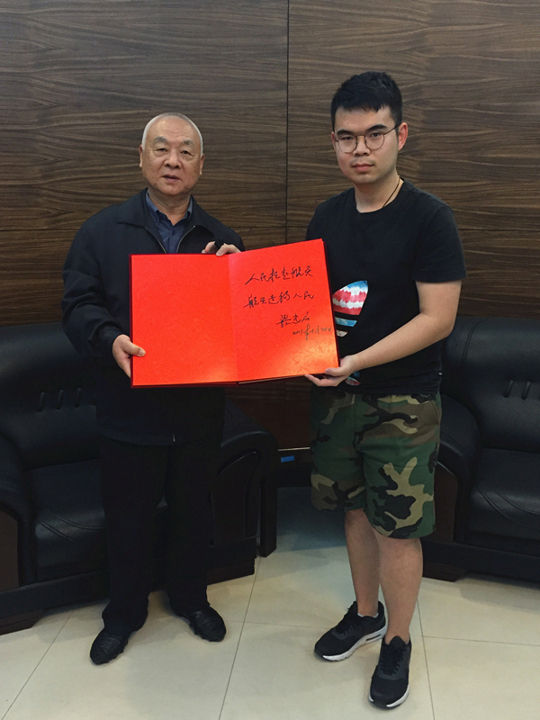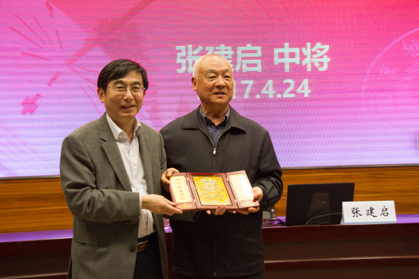 报告会结束后,施大宁副校长向张将军赠送“问天科学讲坛”纪念品,张将军也向我校学生赠与“人民托起航天,航天造福人民”寄语。