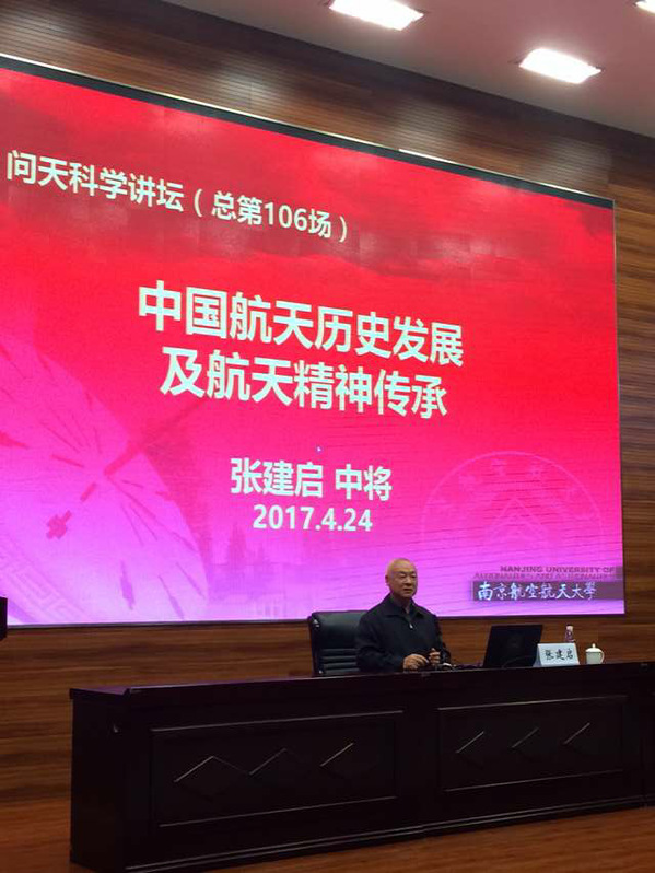 4月24日是中国航天日,在这个有特殊意义的日子里,中国航天基金会理事长、原总装备部副部长兼中国载人航天工程副总指挥、中国载人航天工程发射场系统总指挥张建启中将应邀莅临我校,做客我校第106期“问天科学讲坛”,在将军路校区主楼4楼报告厅为我校师生作了题为《中国航天历史发展及航天精神传承》的报告。报告会由施大宁副校长主持,航天学院院长陈卫东、科协副秘书长刘双丽、研工部副部长王亚彤、航天学院副书记李和新及全校400多名师生参加了报告会。