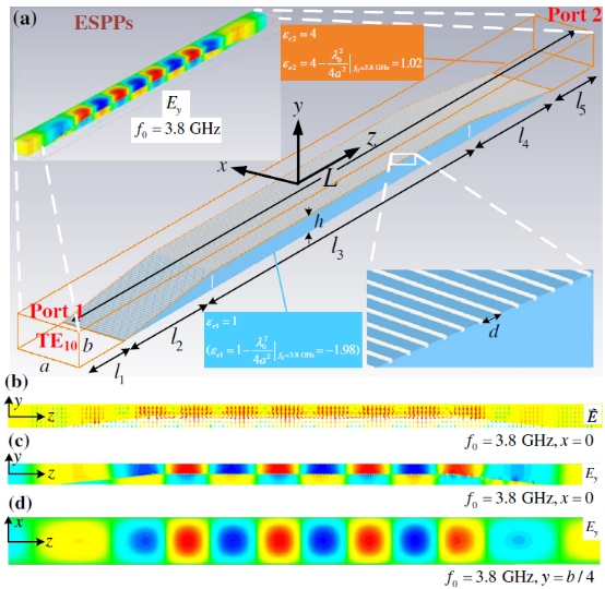 在此项工作中,研究人员另辟蹊径,巧妙地利用金属波导中模式的色散特性和截止特性,建立了等效表面等离激元的物理模型,揭示了等效表面等离激元的色散和传输特性,并在两种普通介质材料的界面上实现了等效表面等离激元的高效激发和超低损耗传输。该工作为低频段人工表面等离激元提供了一个全新思路和实现手段,并有望应用于微波和太赫兹频段的滤波器、谐振器和高灵敏度传感器中。