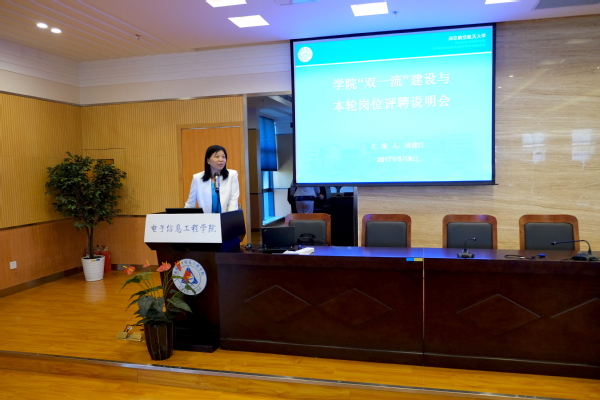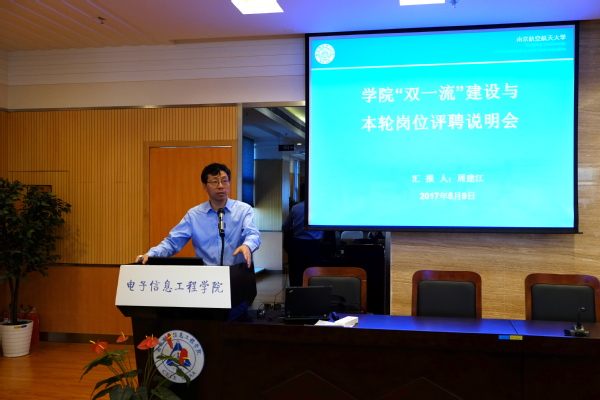 为全面贯彻学校“双一流”建设目标,做好本轮岗位聘任合同签署工作,2017年5月9日,电子信息工程学院召开全院大会,结合“双一流”建设指标对2017-2019年各岗位聘期任务进行解读。会议由院党委书记冯绍红主持,常务副院长周建江做大会报告,学院全体教职工参加会议。