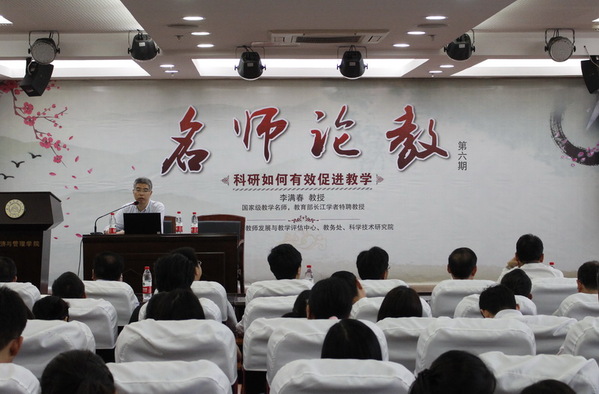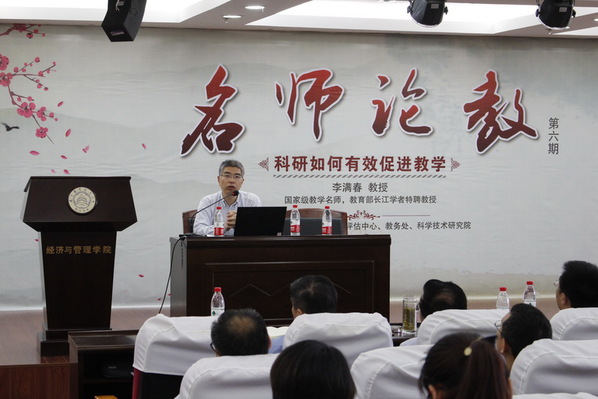 5月12日下午,国家级教学名师、长江学者特聘教授,南京大学李满春教授莅临我校“名师论教”讲坛,在将军路校区经济与管理学院三楼报告厅为我校师生作了“科研如何有效促进教学”的主题报告会。教务处处长王成华教授、科学技术研究院副院长周克印教授出席报告会,来自各学院的教学院长、系主任、专业负责人、本科教学团队责任教授、青年教师代表以及研究生150余人参加了活动。报告会由教师发展与教学评估中心副主任江爱华主持。