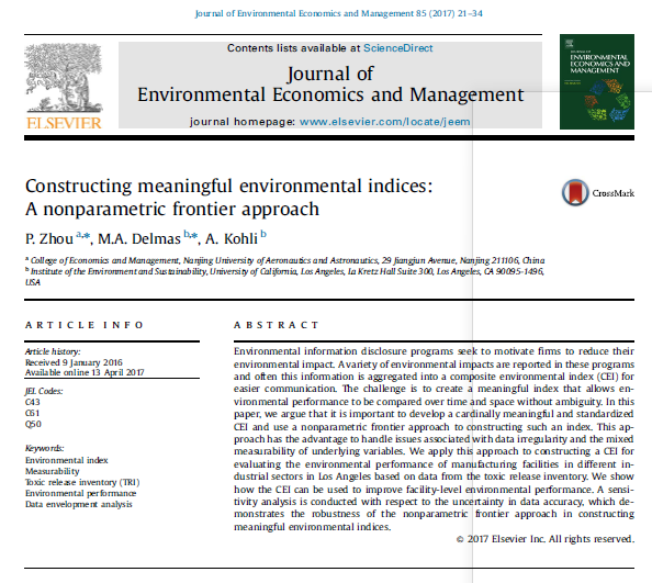综合环境指数由于简单易懂被不同机构用于不同层面(如国家、城市、企业)的环境绩效评价分析,但其结果受所采用的建模方法影响颇大。如何构建一个有意义的环境指数?针对这一科学问题,周鹏教授与加州大学洛杉矶分校Delmas教授等人从数据的基数特性出发,对何为有意义的环境指数做出了理论界定,指出一个具有基数意义的环境指数应该能够保持指数值间的相对差距,无论对基础变量进行何种可容许的变换。在此基础上,作者指出采用一类数据包络分析模型可以得到具有基数意义的环境指数,并将该模型用于评估洛杉矶郡有毒物质排放的环境绩效,实证结果进一步验证了该方法的相对稳健性。论文全文参见链接http://dx.doi.org/10.1016/j.jeem.2017.04.003。该项研究工作得到了国家自然科学基金项目(71625005,71573119 & 71273005)的持续资助。