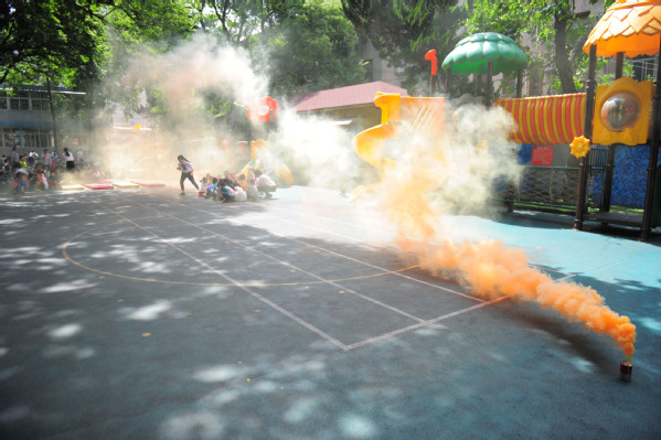 10:10分,园内的过道里突然弥漫着橙色的烟雾(演练用的烟雾弹),紧接着警报声大作!虽然大家感到意外,但是所有人员按照预案要求立刻迅速归位:总指挥李民惠园长坐镇前操场,进行观察和指挥;副指挥及时“拨打119报警”、协助指挥疏散;事先联系好的消防车从附近拉着警报及时出现在幼儿园门口、消防员冲进园内进行“灭火”和协助疏散;班上的三位老师立即组织还在进行教学和游戏的孩子们及时撤离到前、后操场;后勤工作人员按照预案要求各就各位协助班级幼儿疏散……