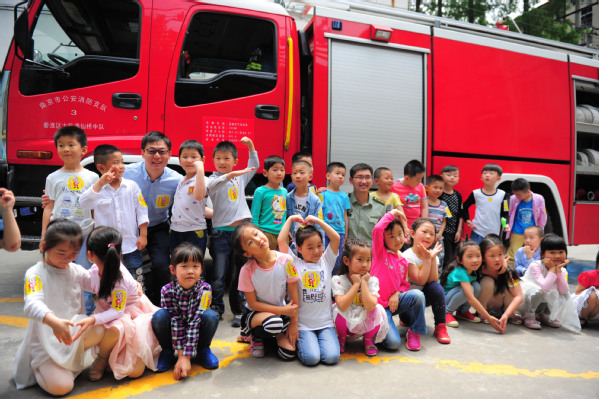 紧急疏散活动结束后,园内拉起了疏散活动的横幅,全园师生集中在前操场,消防中队的王指导员进行了演习后的点评和总结,对孩子们不紧张、不害怕、听从老师指挥、迅速撤退的表现给予了大大的肯定,并请老师给每个孩子贴上了“不玩火·会逃生·我是消防宣传员”的标贴。王指导员还在现场对幼儿进行了安全教育宣传活动,组织了生动有趣的动画人物“消防安全知识”有奖竞答互动活动,孩子们的参与热情高涨!最后,带领孩子们观摩了消防器材和装备,集体观看了消防员叔叔使用消防水枪模拟灭火的表演。意犹未尽的孩子在活动结束后还跟难得一见的消防车进行了亲密合影!