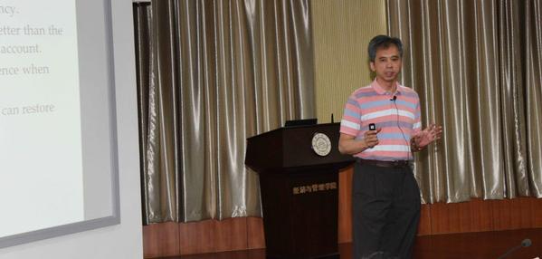 清华大学陈剑教授以“Dynamic production planning with two production modes, switching costs, and carbon price volatility”为题作了报告。陈剑教授现任清华大学经济与管理学院联想讲席教授、教育部长江特聘教授、管理科学与工程系主任。担任中国信息协会常务理事长、中国系统工程学会副理事长、中国优选法统筹法与经济数学研究会副理事以及IEEE系统、人与控制论学会服务系统与组织专业委员会主任。他的研究领域主要有供应链管理、电子商务、服务运营、商务智能、决策分析、企业信息化等。此次报告中,陈剑教授针对时下最受关注的环境问题提出了建立动态生产模型来减少企业温室气体的排放量。陈剑教授以一家企业的两种不同生产技术为例,考虑两种技术间的转换成本,为达到最优营运目标建立了一个动态的生产库存模型。