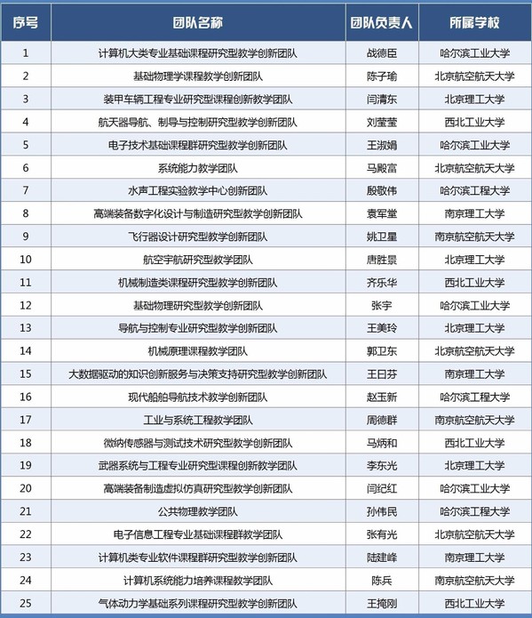 近日,工业和信息化部2016年研究型教学创新团队名单公布,我校共有3个团队榜上有名,分别是以姚卫星教授为团队负责人的飞行器设计研究型教学创新团队,周德群教授为团队负责人的工业与系统工程教学团队,陈兵教授为团队负责人的计算机类专业软件课程群研究型教学创新团队。