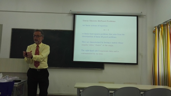 25日下午, Reichel教授在学院547学术报告厅做了题为“Fast computation of the largest singular values and vectors of large-scale discrete ill-posed problems”的学术报告。戴华教授老师等参加了报告会,Reichel教授与参会师生针对报告内容及感兴趣的学术问题进行了热烈讨论。