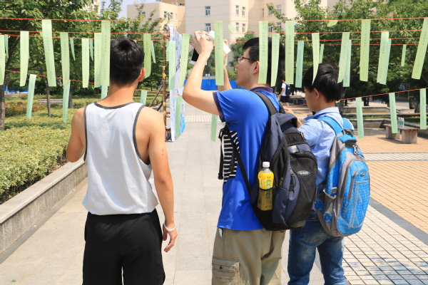 “鸭蛋兜兜是挂在小孩身上用来祈福。”现场身穿汉服的工作人员向同学们介绍着每个节日民俗奖品的来历。在明故宫校区一食堂门口和将军路校区樱花广场,五百多条半句诗词和民俗问题印在绿色的纸条上,学生可以通过回答出纸条上的诗词或问题来获得五彩手绳、鸭蛋兜兜、凉茶、福字粽等满载端午民俗风味的奖品。排队参加活动的学生队伍宛如长龙,现场洋溢着浓浓的节日氛围。