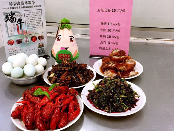 在“好玩”的民俗活动之外,南航食堂还要把“好吃”做到师生心中,南京本地端午有吃“五红”的传统,分别是“烤鸭、苋菜、红油鸭蛋、龙虾、黄鳝”。南航饮食中心在两校区多个食堂推出了“五红”套餐:红彤彤的小龙虾、油亮亮的鸭蛋、金灿灿的烤鸭、鲜嫩多汁的红苋菜,肥嫩的红烧鳝段,受到校内师生的欢迎。