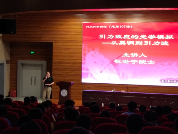 2017年5月31日,中国科学院祝世宁院士应邀访问我校,参观了我校雷达成像与微波光子学教育部重点实验室,并做客我校“问天科学讲坛”,在将军路校区报告厅为我校师生作题为“引力效应的光学模拟--从黑洞到引力波”的精彩学术报告。报告会由电子信息工程学院常务副院长吴启晖教授主持,副校长施大宁、科协副秘书长刘双丽及电子信息工程学院、材料学院、理学院等学院师生300余人参加了此次报告会。