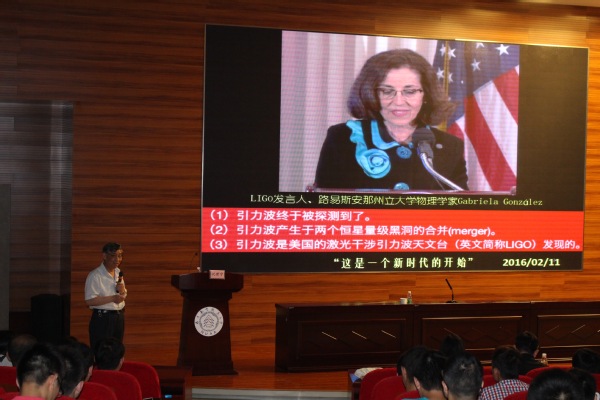 报告会上,祝院士从引力波的产生讲起,介绍了爱因斯坦的思想实验、霍金辐射与安鲁效应,讲解了星系中的超大黑洞,并就如何用光学方法模拟引力场、如何构建和观察光子黑洞进行了深刻阐述,给大家带来了一堂生动的科学报告。最后,祝院士与在场的师生进行了交流互动,耐心解答了师生提出的问题。