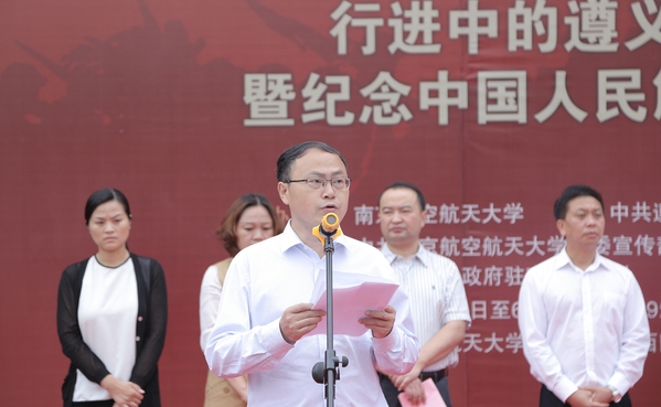 6月6日上午,由贵州遵义市委、市政府和南京航空航天大学联合主办的“遵义会议永放光辉——行进中的遵义会议纪念馆主题展览暨纪念中国人民解放军建军九十周年南京航空航天大学巡展”在将军路校区西区体育中心开幕。遵义市委宣传部部务会成员、市文改办主任杜宇,我校党委常委、纪委书记杭育新在开幕式上致辞。遵义会议纪念馆馆长陈松、副馆长吴德坤、遵义市驻南京办事处负责人陈世奎等出席,我校各院级党组织书记,党政办、组织部、宣传部、学工部、研工部、团委等有关单位负责人,师生代表参加仪式。校长助理陶勇主持开幕式。