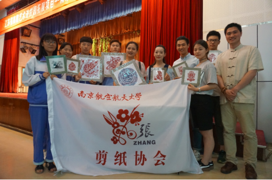 舞蹈《剪纸姑娘》拉开了此次表演的序幕。富有剪纸气息的服装与姑娘们活泼俏皮的舞蹈,吸引了全场师生的注意力。而在舞台的一侧,南京剪纸的传承人——张钧也在进行着他的现场创作。舞蹈结束时,张钧也完成了他的创作。精湛的剪纸技艺赢得了全场的掌声。