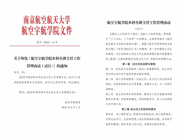 如何更好发挥班主任在育人中的作用,规范、明确、可执行的规章制度是基础。2015年,学院出台《航空宇航学院班主任工作暂行办法》,这一制度对学院班主任的“选聘与管理”、“工作职责与要求”以及“考核与奖励”等方面均给出了明确的要求,即:班主任应具有良好的师德师风,较高的学术水平,由系所推荐,学院审核;班主任除了指导班级建设、协同辅导员进行班级的日常管理外,还应及时掌握学生的思想动态、学习状况,组织并鼓励其参与集体活动、科创活动等;班主任的工作由学生、辅导员、教学办根据管理办法进行综合考核,每学期对班级每门必修课程至少听课1次,每月至少召开班会或组织活动1次,每学期至少与每位学生有针对性单独谈话1次;教师在晋升职称时,必须要有班主任工作经历且工作合格等等。