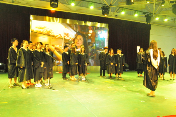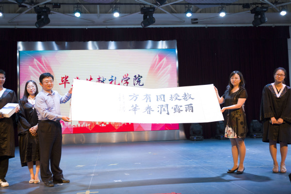 随后毕业生代表刘婷炜、马仁萍和张国军为学院送上了毕业生们精心准备的礼物:一幅写有“教授固有方 雨露润春华”十个大字、盖有366名经管毕业生印章的卷轴和一份象征着祝福和传承的储蓄罐。学院院长周德群和学院党委书记焦宏图代表学院接受了毕业生的献礼。之后,全体毕业生在现场为学院送上了一份特殊的礼物,大家齐声合唱由周德群院长填词的《经管毕业歌》,优美的旋律和动人的歌词饱含了毕业生们对南航、对经管深深的爱。