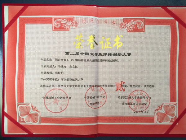 近日,从第二届“全国大学生焊接创新大赛”传来喜讯,我校薛松柏教授指导的《铝-铜异种金属火焰钎焊用钎剂改进研究》项目荣获了大赛二等奖。