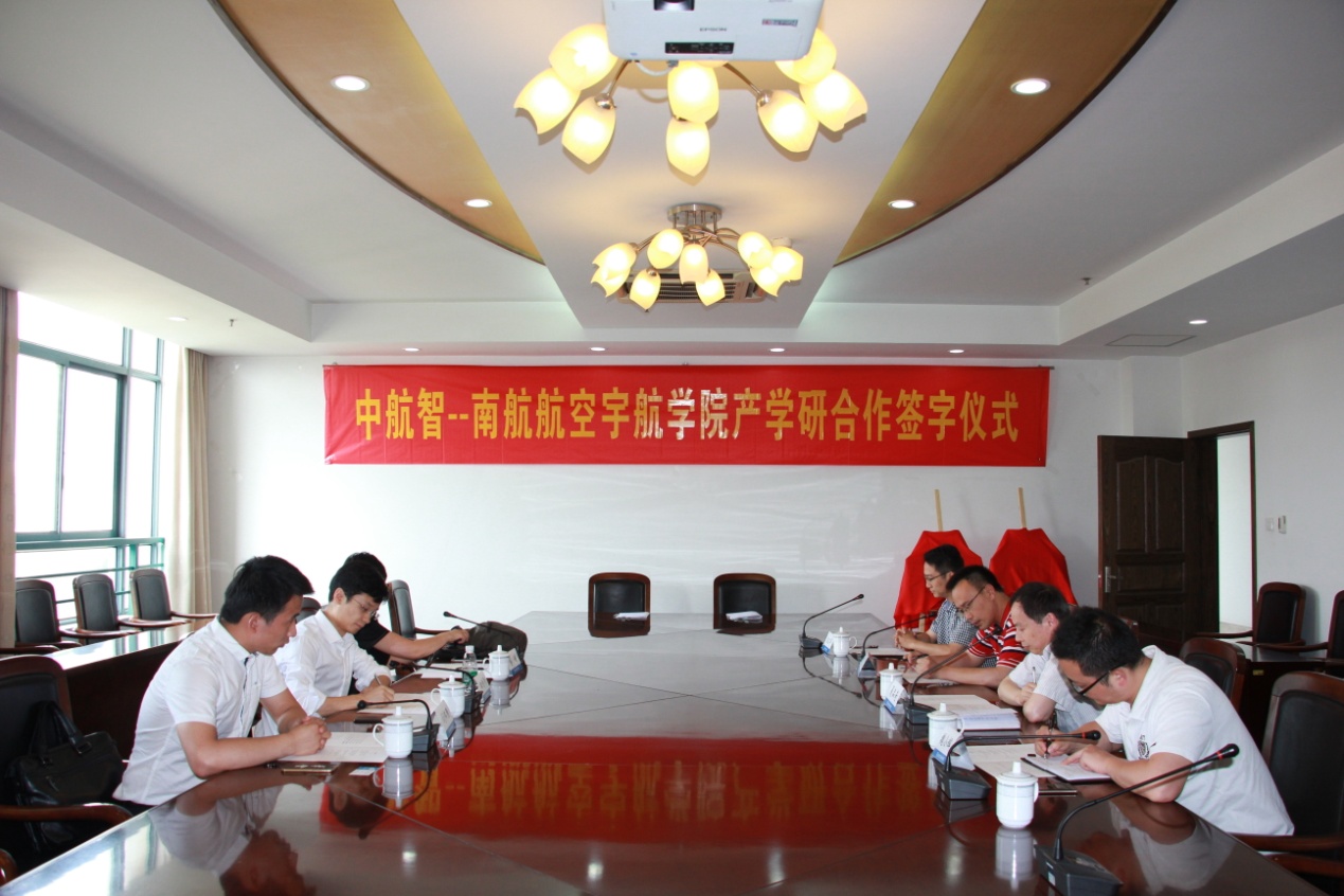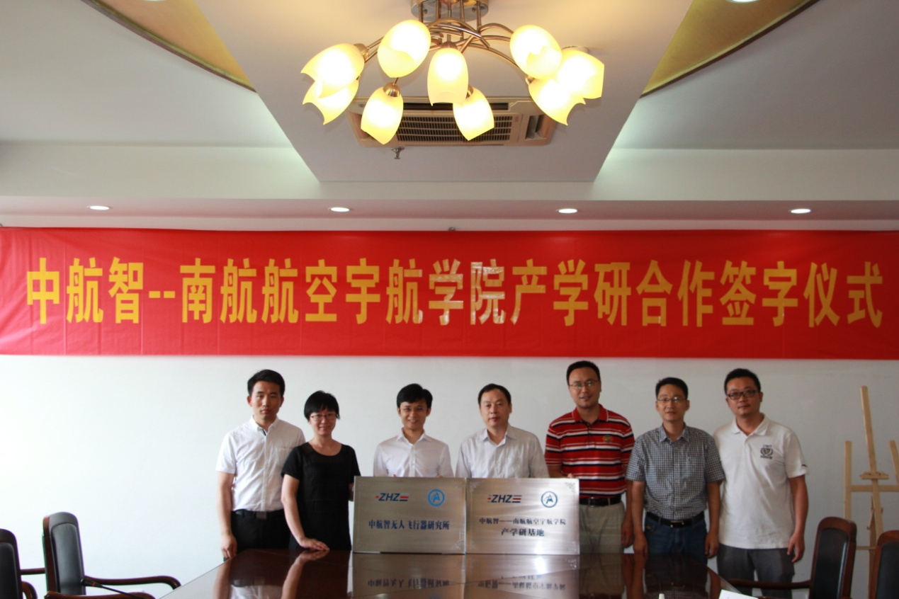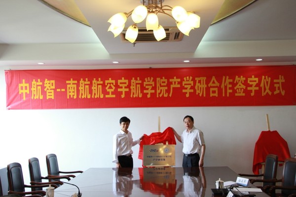 夏品奇院长与田刚印总裁共同签署了北京中航智科技有限公司南京航空航天大学航空宇航学院校企合作协议书,并为“南京航空航天大学中航智无人飞行器研究所”、“中航智-南航航空宇航学院产学研基地”揭牌。