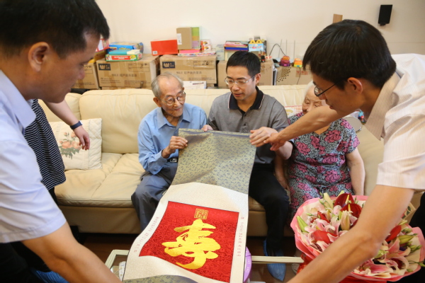 一进家门,杭书记就紧紧握住许老的手嘘寒问暖,转达了郑永安书记和聂宏校长对许老百岁大寿的祝福,并代表学校为老人送上鲜花、蛋糕和“寿”字云锦,希望他保重身体、长寿安康。交谈中杭书记详细询问了许老的身体状况和家庭情况,并向许老介绍了学校这几年的发展和变化,杭书记说,许老是在建校初期来到南航,以许老为代表的老一辈为学校的建设和发展做出了重要贡献,全体南航人永远不会忘记。他代表学校感谢许老多年以来为学校和外语教学做出的贡献,并满怀深情地祝愿老人保重身体,阖家幸福,健康长寿。许老精神矍铄、身体健朗,他衷心感谢学校领导、同事对他的关心,并深情地回忆起自己的求学和工作经历,表达了自己对学校深厚的感情,许老还高兴地从书橱里抱出近年翻译的两本手稿给来访者传阅,并与外国语学院范祥涛院长饶有兴致地交流起当今翻译界的热点问题。在得知许老在93岁高龄还出版了翻译著作时,在场者都为他活到老、学到老的勤学态度所感动,杭书记对许老笔耕不辍、一丝不苟的学术精神给予了高度评价。现场笑声不断,气氛热烈而融洽。