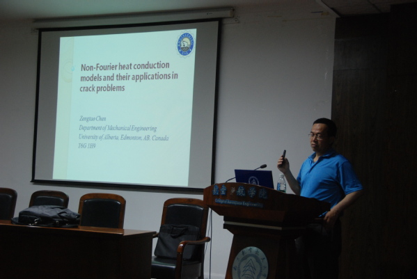 应我校航空宇航学院机械结构力学及控制国家重点实验室高存法教授邀请,加拿大阿尔伯塔大学陈增涛教授于2017年7月1日至5日访问了我校,并于7月4日为我校师生做了题为“非Fourier 热传导理论及在断裂力学中的应用”的学术报告。报告内容丰富、生动、精彩,介绍了固体热传导问题的前沿研究工作,对我校相关科研工作具有借鉴作用。同时,陈增涛教授还结合自己多年的研究经历,讲述了如何在传统科研问题中发现新的亮点等。钱征华教授主持了此次报告会。
