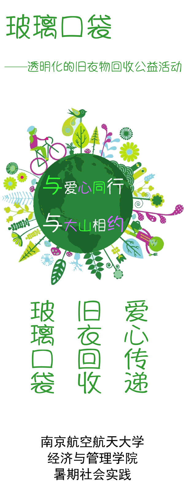 7月,经管院“玻璃口袋,透明化的衣物捐献公益活动”暑期社会实践活动,在南航大校园以及南京建邺区社区开展爱心旧衣回收活动,为美丽中国的建设贡献自己的一份力量。同时与江苏利华环保科技有限公司开展合作,将回收的爱心旧衣物进行分拣消毒,将真正有用的衣物送到需要的人手中,而部分不符合捐赠标准的衣物也将用于工业与环保再利用,促进绿色生活的形成。