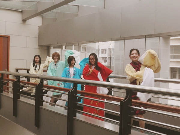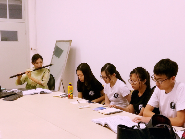 团队提前联系到同济大学昆曲研习社的指导老师——沈小燕老师,并且获得她全程的热切支持。冒着酷暑,团队如约与该社成员相会在同济大学人文学院。沈小燕老师为大家精心安排了昆曲唱腔、身段教学体验,以及同济学员的唱段表演,队员们惊叹于她们的唱功,自己也学得有模有样。穿上戏服,甩起水袖,虽然作为初学者难免有些不自然,但是在老师的悉心指导下,队员们放开自我,在闷热的环境中体会到了从未有过的乐趣,也由衷地对昆曲艺术家们肃然起敬。大致游览了同济校园之后,两校同学更是开展了一场深入的座谈,与不同专业的昆曲爱好者进行交流,建立起难得的深厚友谊。沈小燕老师对于队员们拜访过顾笃璜老先生表示认可和欣赏,侃侃谈起自己与顾老的交往以及两人意见上的相同与不同之处,令队员们受益匪浅。