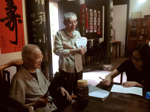 团队先是来到位于苏州网师园附近的昆剧传习所,拜访昆曲大家顾笃璜先生。见到顾笃璜先生之前,队员们在传习所的门口与早早来此等待的曲友进行了亲切的交流,老先生对于爱好昆曲的年轻人们热情非常,兴致勃勃的介绍起昆曲,讲述他与顾老的缘分,并且表达了他对于新一代大学生的殷切期待。初见顾老,队员们便被其一言一行中彰显的文人气质所吸引,恭敬列队表达自己的尊敬之情。顾老虽已耄耋之年,但是却精神矍铄,对于大学生团队的来访,非常热情也非常诚恳地表达了他的支持。