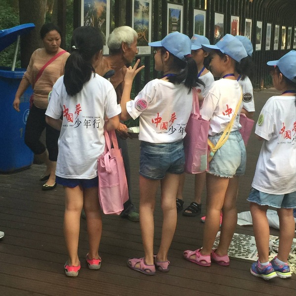 在队长的指挥下,大家迅速分好工,向游客发放问卷,并且为他们讲解提前准备好的中山陵和孙中山先生的历史文化故事。通过与环卫大爷的交流,团队成员们还了解了景区内的卫生状况和游客们的文明状况——人们的素质越来越高,不文明的行为也是越来越少。随后,团队成员又采访了南下进行华东五市游的大叔大妈们,询问了他们对于旅游团的感受以及看法。他们回答道:导游对中山的解说很到位,体验很不错。在栈道上有位生病的老人在乞讨,很多暑假游的学生们伸出了援手。赞叹之余,充满爱心的团队成员也都给予了老人帮助。