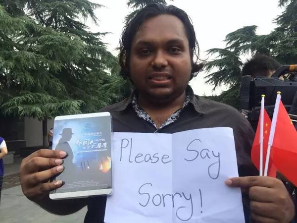 参加集会的我校航空工程研二留学生尼哈德特意带了《外国人眼中的南京大屠杀》和写了“Please Say Sorry!”。他说,“我写它的原因是,现在有些国家不承认南京大屠杀的历史。我6年前来到南京,此前也不知道南京大屠杀。每次看完《外国人眼中的南京大屠杀》,我都会哭。”他希望那些不承认南京大屠杀历史的人能看到这些影像,能对南京人民和南京大屠杀中遇难的人们正式道歉。“我也想告诉全世界的青年人,和平与发展是最重要的。”