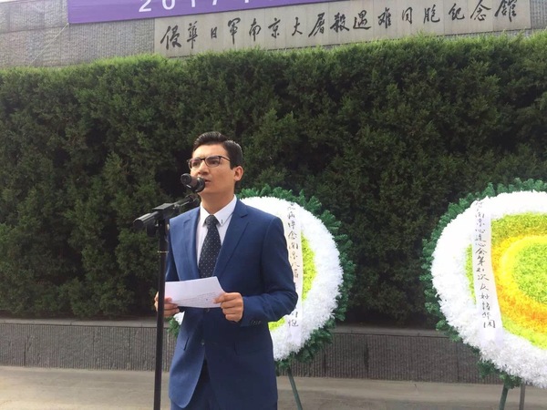 来自巴基斯坦、目前在我校就读国际贸易专业的留学生代表李卡说,“1945的今天,挑起罪恶侵略战争的日本宣布无条件投降,世界反法西斯战争取得了最终的胜利。72年后,我们相聚这里,缅怀历史、珍爱和平。这里每一寸土地、每一块砖石,都镌刻着中国人民深受民族苦难的历史记忆。铁一般的实证,时刻唤醒每一位善良的人们对和平的向往和坚守,全世界热爱和平的青年学子都应牢记身上肩负的历史责任。今天的和平集会让我深受教育,维护和平任重道远,让我们年青的国际学生一起,从我做起!将和平牢记心中,成为历史记忆的传播者,做世界和平的维护者!”