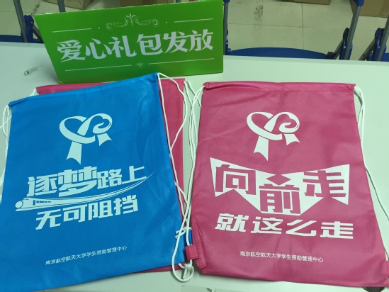 学校还为贫困生家长解决了开学期间的食宿问题,后勤集团发放了免费餐券,并提供免费住宿。除此以外,新生们还能获得一个“爱心大礼包”,包含300元的校园卡充值卷、150元的教育超市购物券、50元文化产品购物券、南航特色飞机U盘、书籍等。