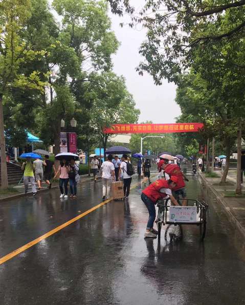 迎新第二天,阴雨连绵,小红帽坚持在雨中进行服务,接下来这段对话让人感动:家长问:为什么不穿发的雨衣?小红帽答:雨衣很长,骑车不安全,自己摔了不要紧,万一撞到别人呢?