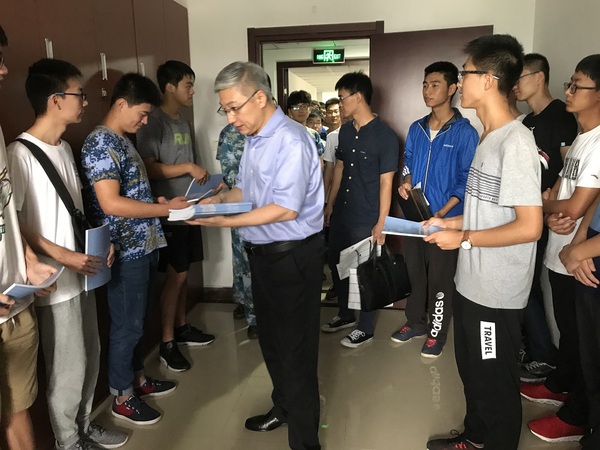 院长一行到达新生寝室,对同学们的到来表示欢迎,并与同学们亲切交谈,希望同学们能围绕学业出发,合理分配学习与娱乐的时间,多参加校内的各类活动,多去锻炼自己的综合素质,尽快适应大学生活,期待同学们能够培养航天人的品质与情怀,肩负起建设航天强国的历史担当。新生听了院长慷慨激昂、诙谐幽默的话语,对大学更多了一份憧憬与振奋。最后,院长向同学们发放了《航天学院十周年志》,希望新生们能更好的了解航天学院,也希望航天学院能给新生一种家的归属感。随后,院长向学生代表赠送了《载人航天工程》和《志在长空,威震空间》的航天纪念品,鼓励同学们珍惜大学四年的美好时光,好好学习航天知识,报效国家。