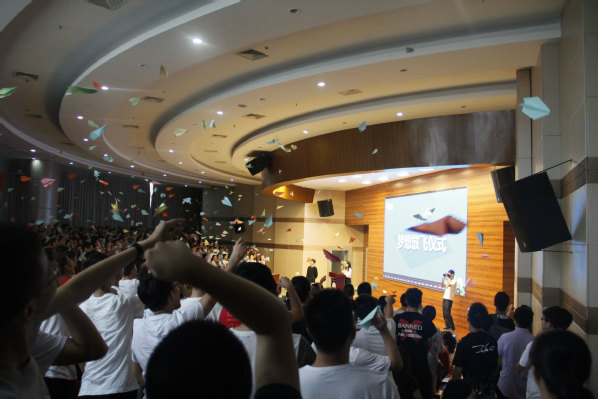 新生们在工作人员的组织下,将五颜六色的卡片叠成纸飞机并在飞机上写下自己对一年后的期望。伴随着嘹亮的国歌,新生见面会正式拉开了帷幕。