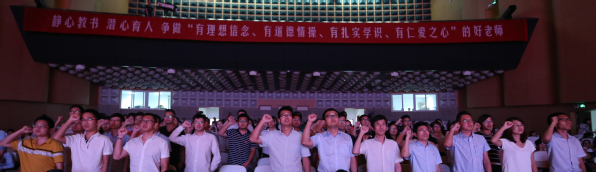 在马亚杰老师领誓下,新教师进行了庄严的入职宣誓,“我志愿成为一名人民教师,忠诚党的教育事业……做到有理想信念、有道德情操、有扎实学识、有仁爱之心……”铿锵嘹亮的宣誓声表达着他们献身教育事业、续写南航明天辉煌的决心。