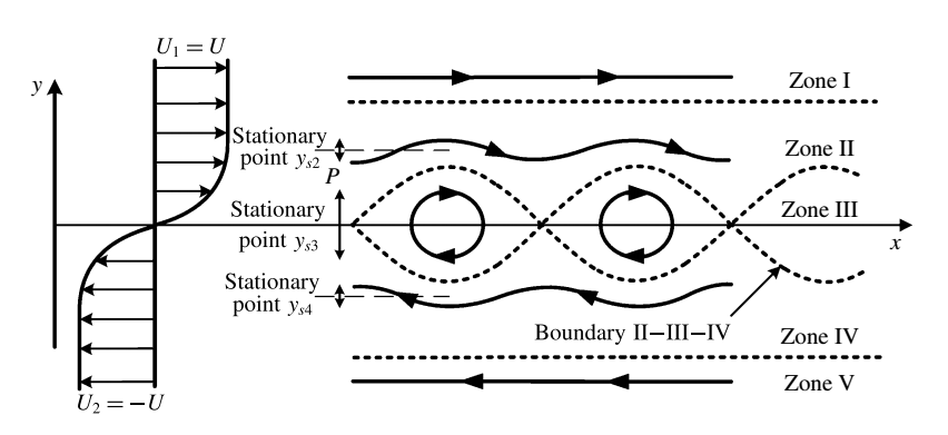 此次在JFM上发表的论文,从N-S方程出发基于分离区剪切流近似、Stuart涡列模型及拉格朗日方法(流动图画如下图所示),对典型拟序分离流动结构建立了反映混沌非定常分离流的简化模型(SCDM模型):